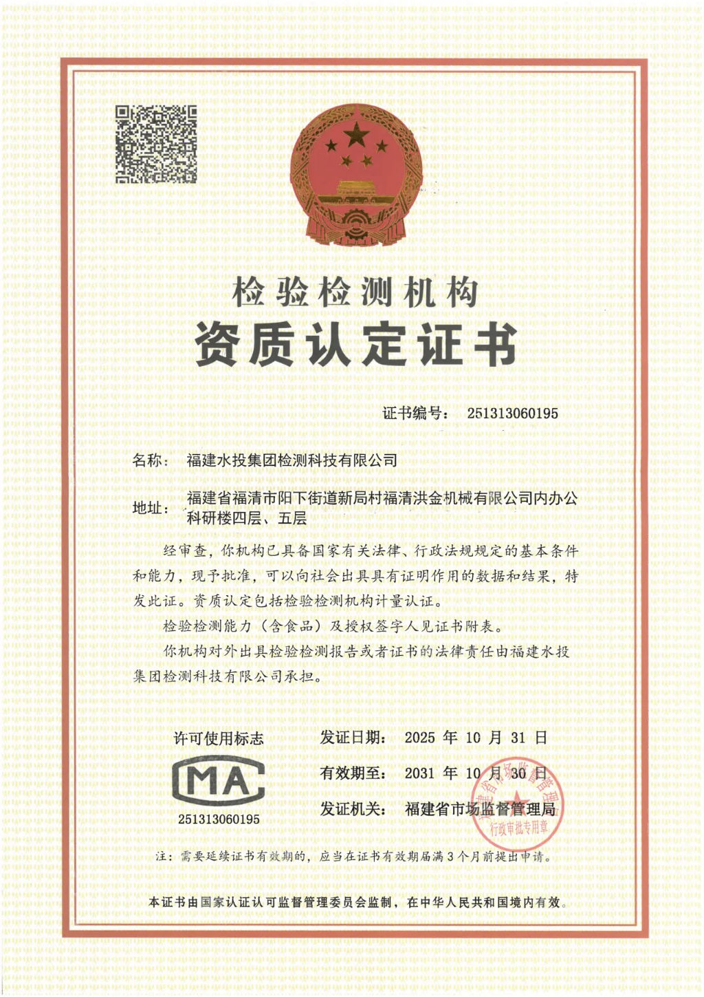 近日,福建水投集團(tuán)檢測科技有限公司順利通過水質(zhì)指標(biāo)檢測能力CMA資質(zhì)認(rèn)證,涵蓋生活飲用水、水和廢水2大類74個項(xiàng)目,...